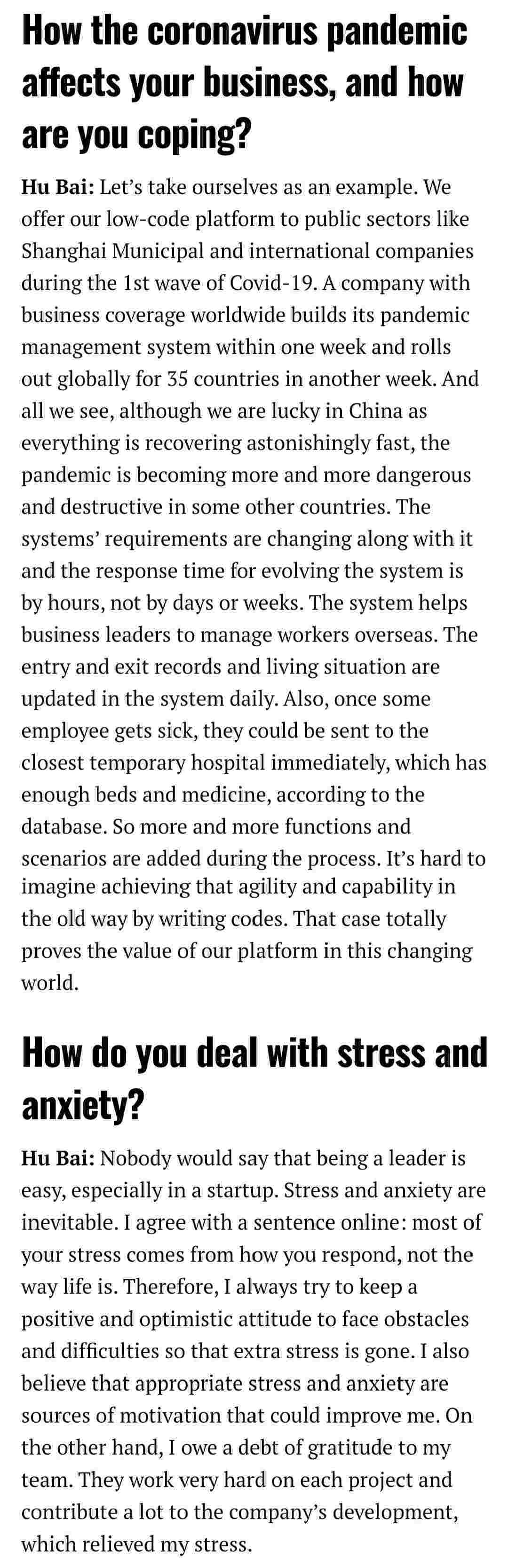 2021年年初,,,,,,,爱湃斯科技CEO胡柏受邀接受法媒Startup.info的专访,,,,,,,,,与Startup info的读者分享了自己的创业经历、、、、、、、、、、、、、以及低代码平台华为钱包的创新之处。。。。。。。